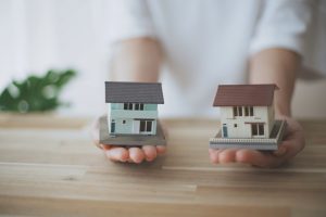 2つの住宅模型を持つ人の手元